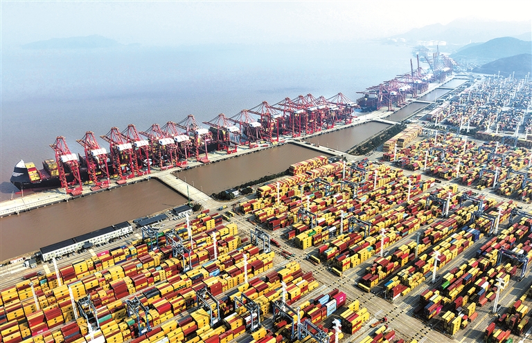 近日,浙江省宁波市北仑区霞浦街道物流工业社区,满载集装箱的集卡车穿梭不息。邻近的宁波舟山港,吊臂林立,一派繁忙景象。