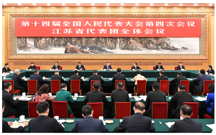 3月5日下午,中共中央总书记、国家主席、中央军委主席习近平参加他所在的十四届全国人大四次会议江苏代表团审议。新华社发(盛佳鹏 摄)