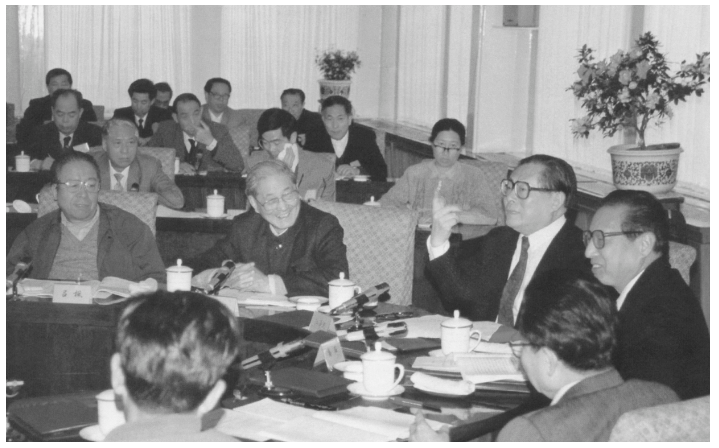 1991年4月,江泽民同志、宋平同志(前排左二)等与参加党建理论讨论会的代表座谈。新华社发