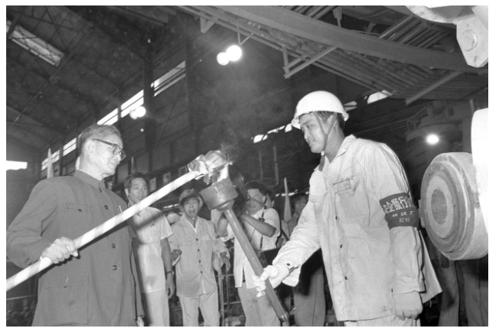 1985年9月15日,我国第一座日产万吨铁的高炉——宝钢一号高炉点火试生产。这是宋平同志(左一)为高炉点火。新华社记者 张平 摄
