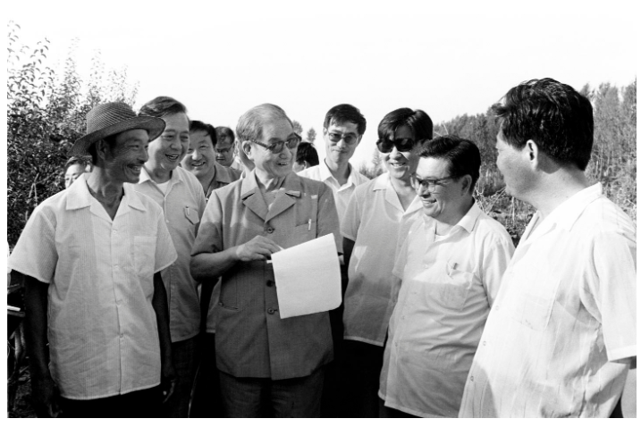 1990年7月中下旬,宋平同志(前左二)来到内蒙古自治区巴彦淖尔市临河区马场地村了解基层党支部建设情况。新华社记者 施长江 摄