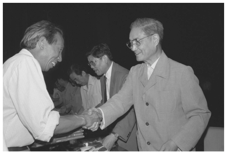 1991年6月26日,中共中央组织部、中共中央宣传部等单位在北京召开大会,表彰全国高校优秀思想政治工作者。这是宋平同志(右)向获奖的个人颁奖。新华社记者 张燕辉 摄