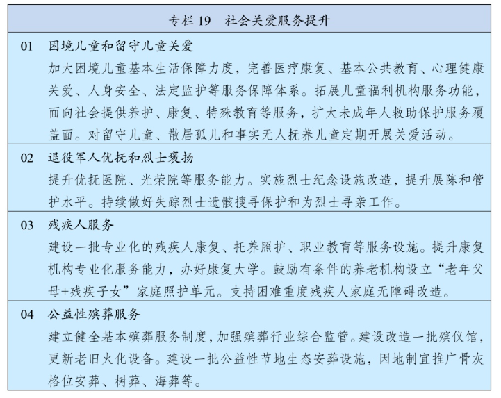 完善残疾人社会保障制度和关爱服务体系,促进残疾人事业全面发展。强化对重度残疾、多重残疾、一户多残等群体兜底保障,健全困难残疾人生活补贴、重度残疾人护理补贴制度及补贴标准动态调整机制,加强残疾儿童康复救助,健全残疾人辅助器具适配补贴制度。完善残疾人社区和家庭支持,加强重度残疾人托养照护,发展精神障碍社区康复。强化残疾人就业帮扶,完善按比例就业、集中就业、自主就业促进机制。发展残疾人文化体育。深入推进科技助残,加强公共设施、信息交流、社会服务无障碍环境建设。