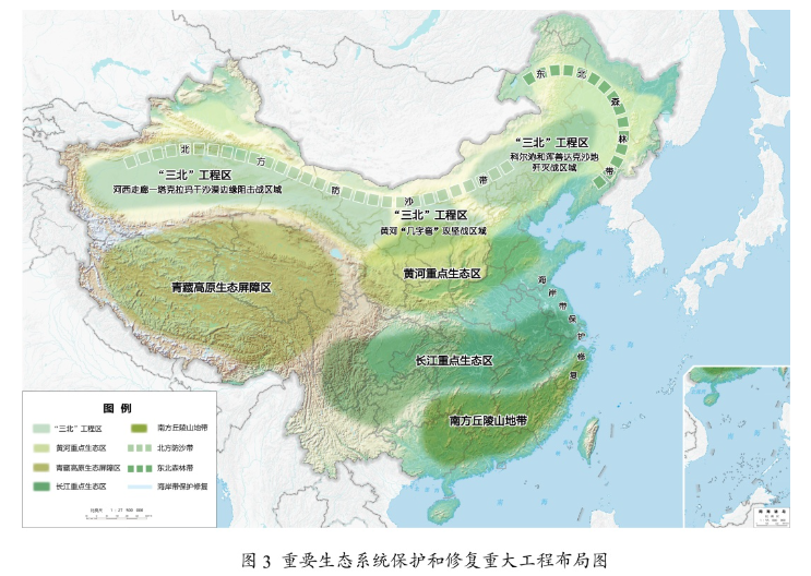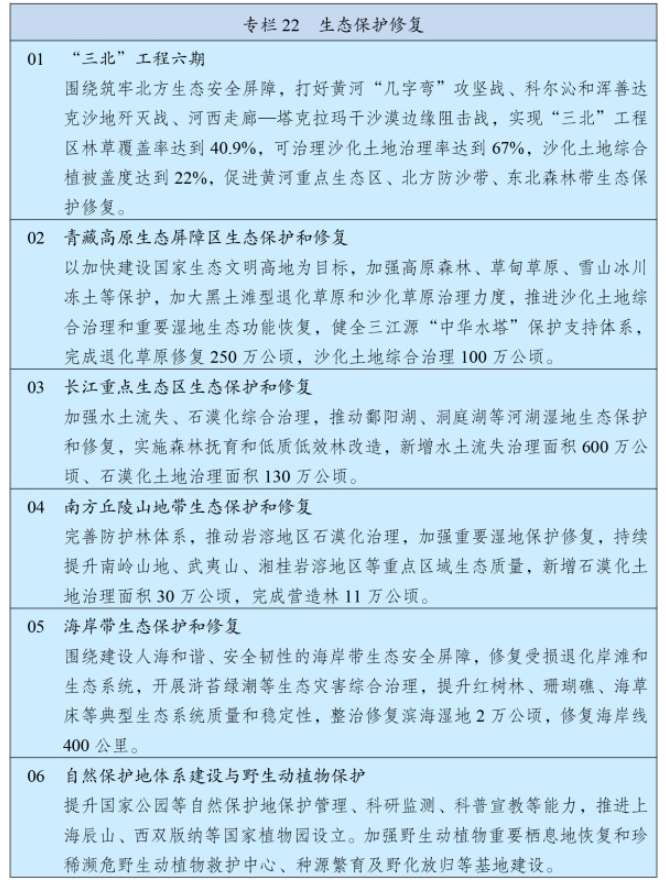 统筹推进重要生态系统保护和修复重大工程,持续巩固以“三区四带”为骨架的国家生态安全屏障体系。打好“三北”工程攻坚战,推动三大标志性战役取得决定性胜利。深入推进青藏高原生态保护,加强重点区域水土流失治理和石漠化治理。科学开展大规模国土绿化行动,推进森林质量精准提升和国家储备林建设,森林蓄积量达到224亿立方米,统筹草原生态修复与合理利用,加强湿地保护修复。推进超引地表水和超采地下水治理,开展历史遗留废弃矿山生态修复。