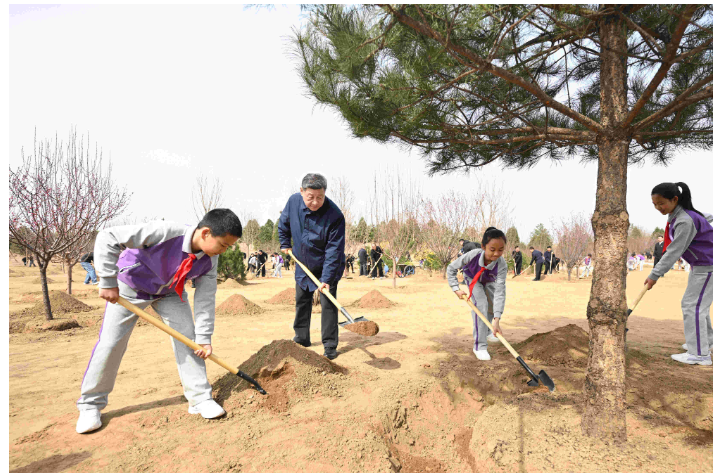 挥锹铲土、培土围堰、提水浇灌……习近平接连种下油松、北京牡丹、榆叶梅、杜仲、元宝枫等多棵树苗。他一边植树,一边询问孩子们的学习生活、劳动锻炼和参加植树情况。习近平强调,青少年像小树苗一样充满活力和希望,要从小树立远大志向,爱知识、爱劳动、爱自然,德智体美劳全面发展,努力成长为栋梁之材。现场气氛热烈,一派繁忙景象。